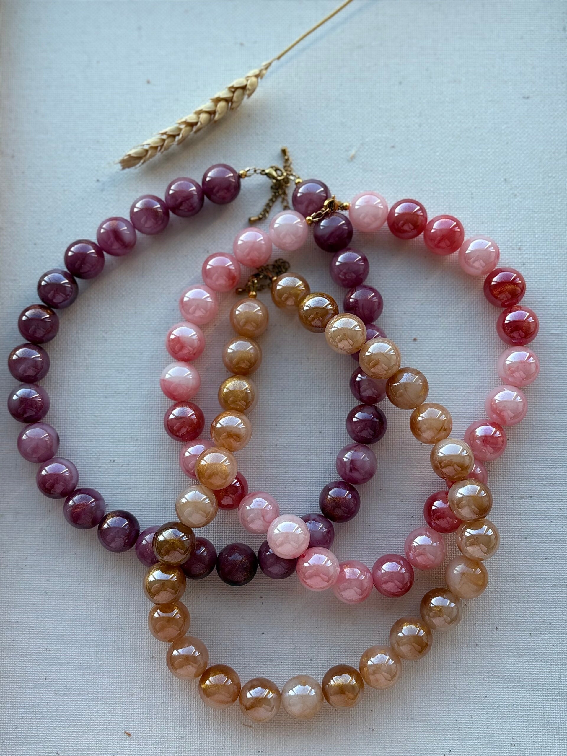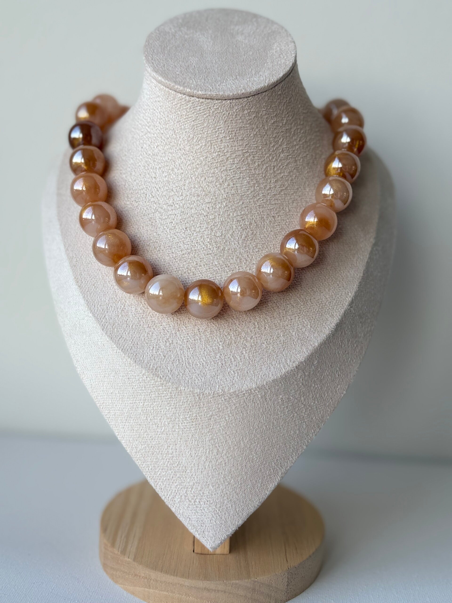 Ketting Mila heeft een zachte, elegante uitstraling dankzij de pastel kleurige acryl kralen met warme accenten. Een rustige maar luxe ketting die geschikt is voor dagelijks gebruik én speciale momenten