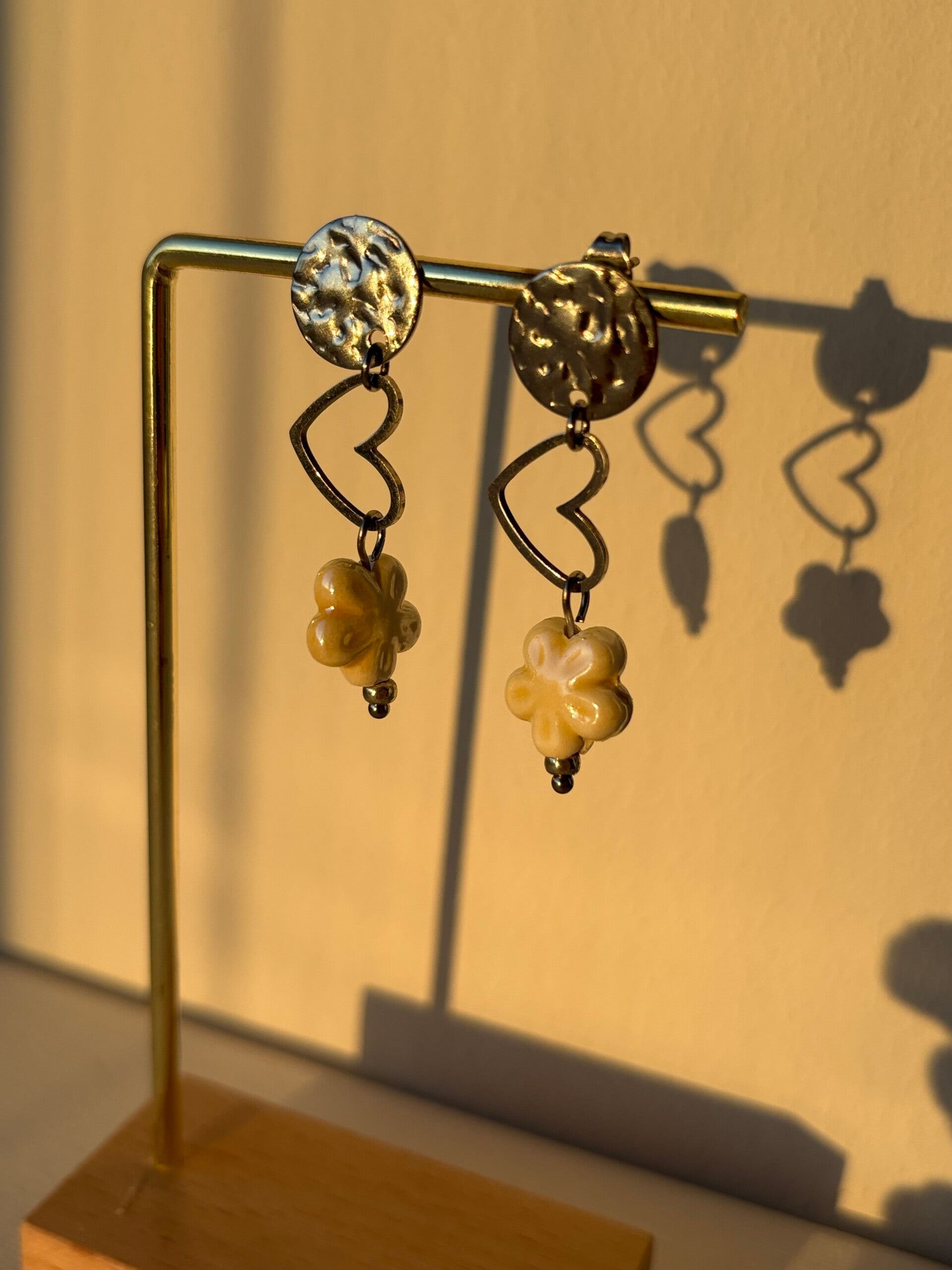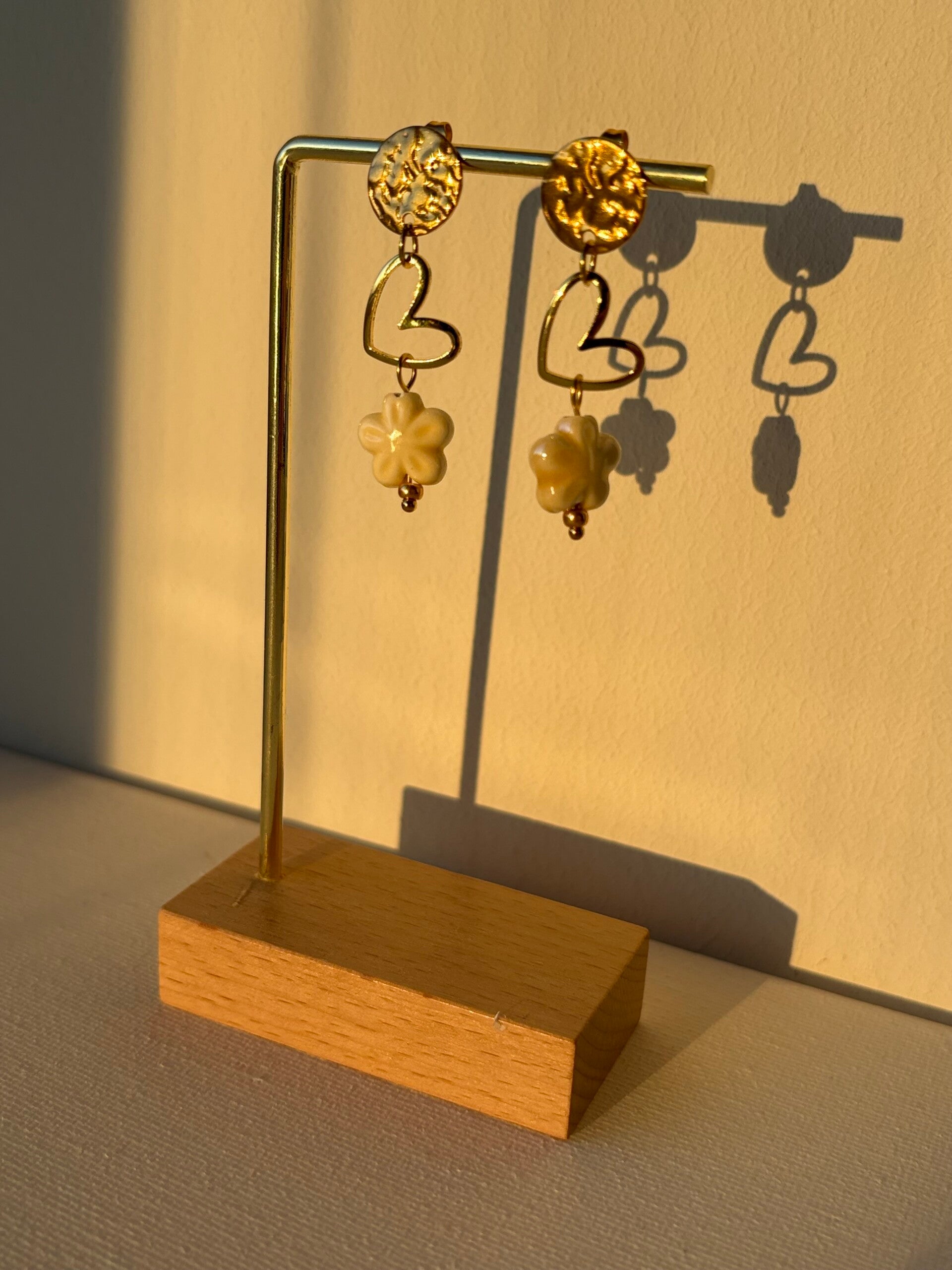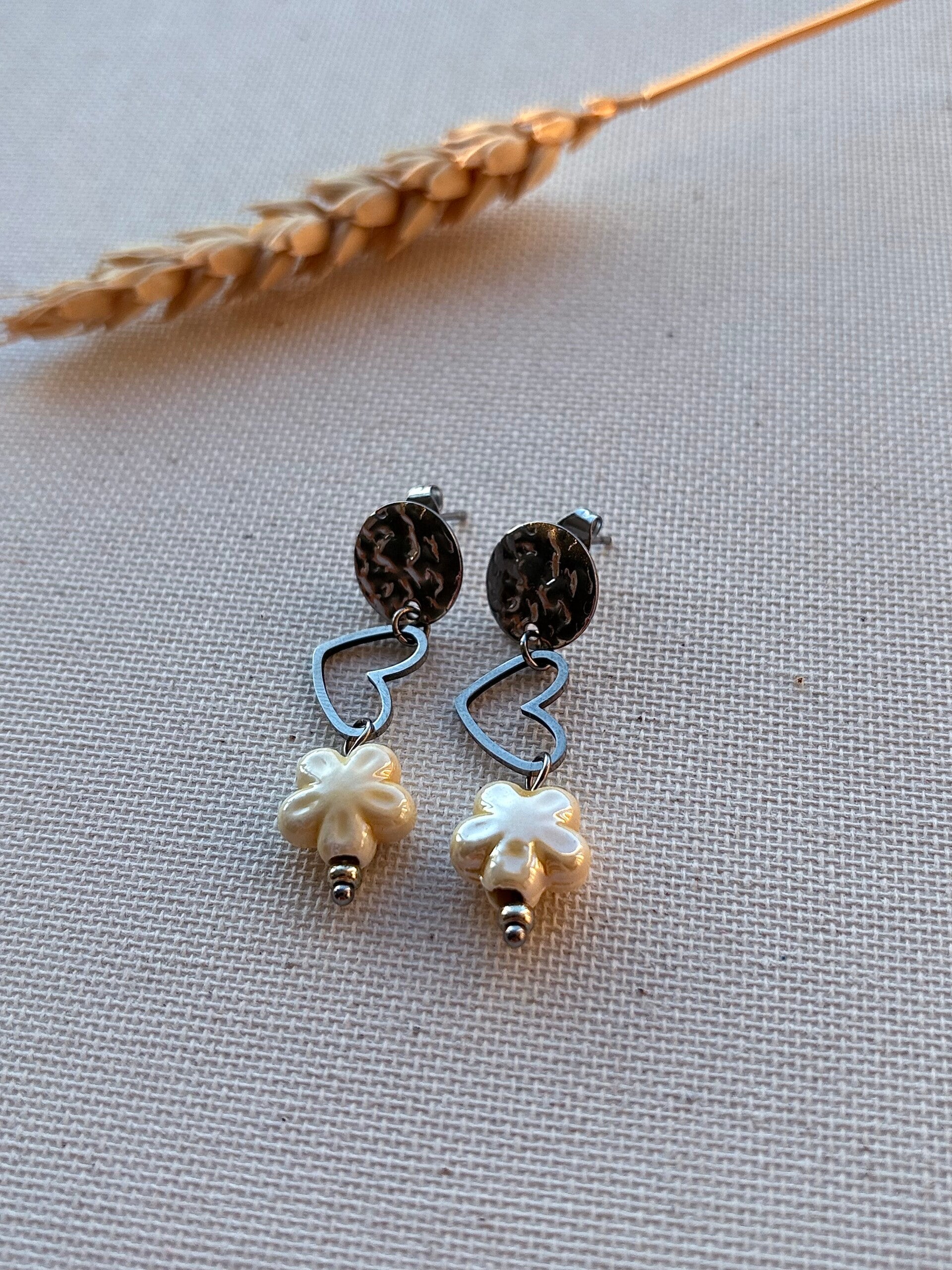 Amélie is een elegante oorbel met een subtiel hartaccent en een fijn keramieken bloemetje. De zachte kleur in combinatie met het goudkleurige staal zorgt voor een romantische en stijlvolle uitstraling.